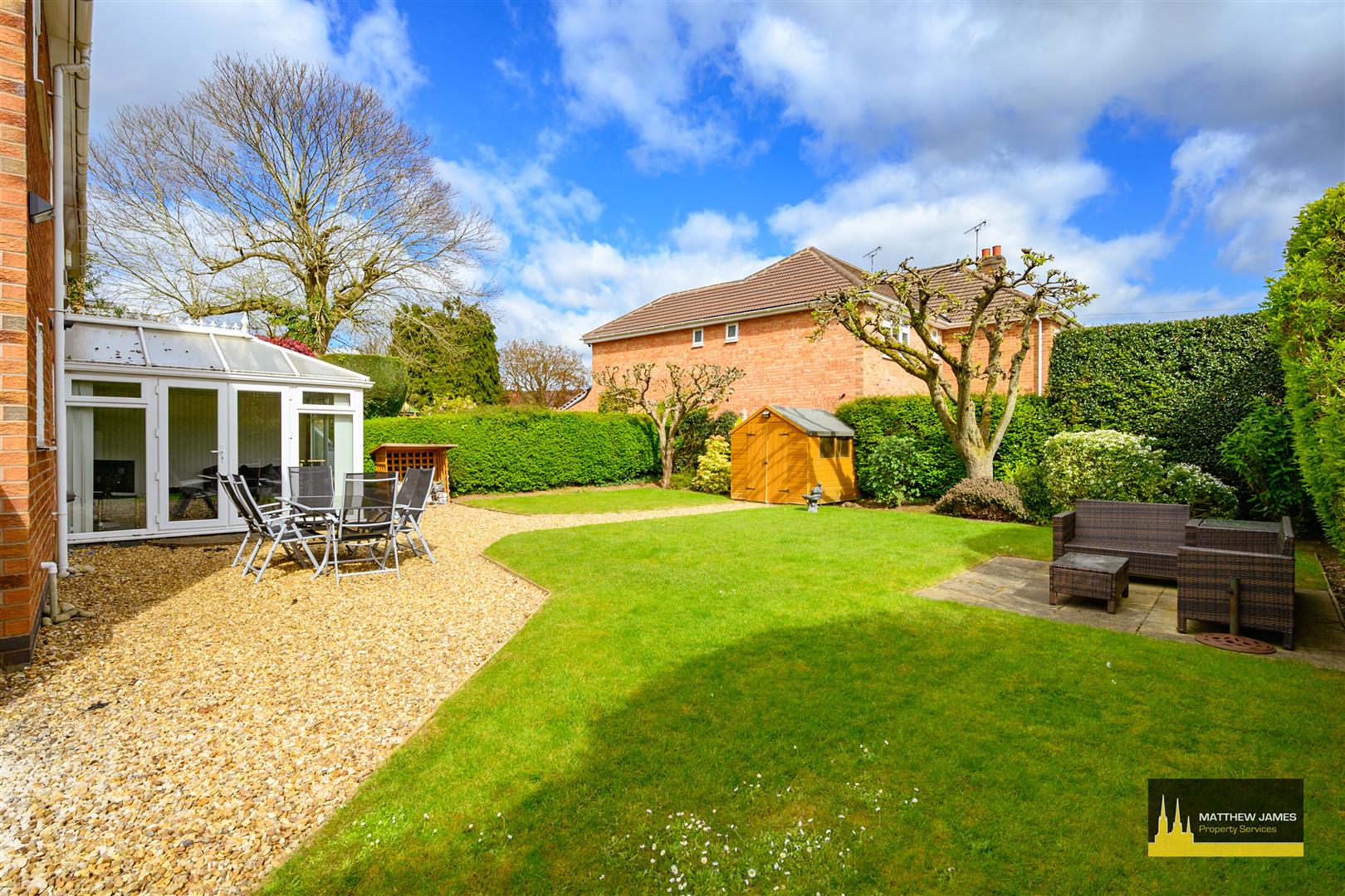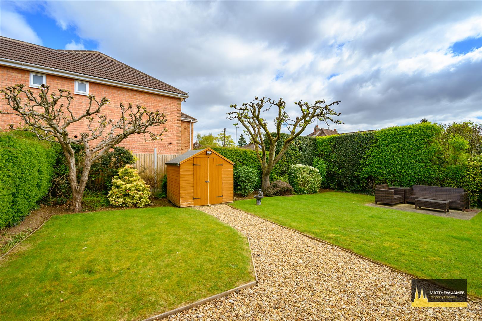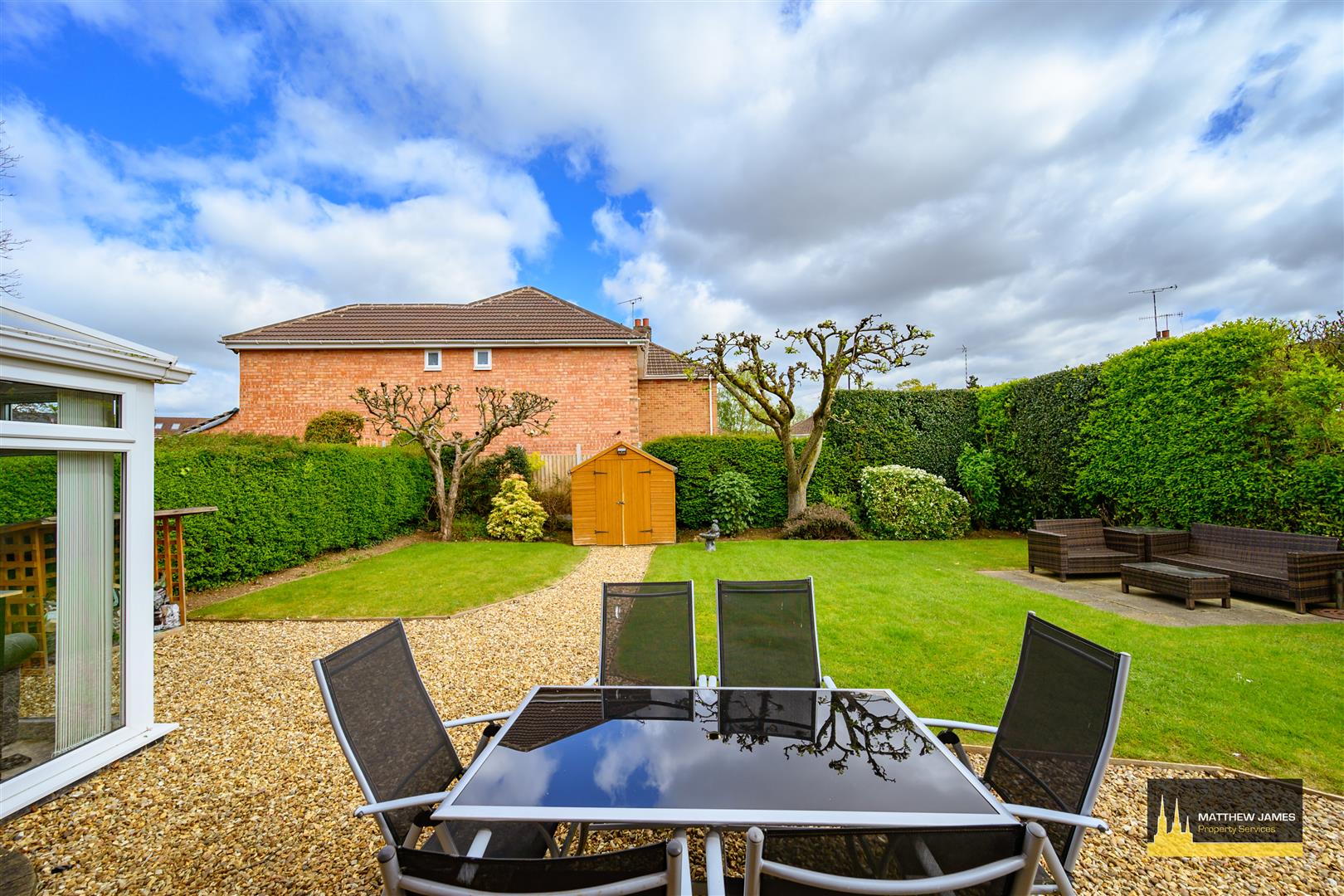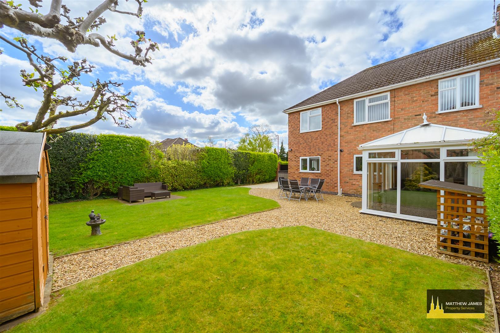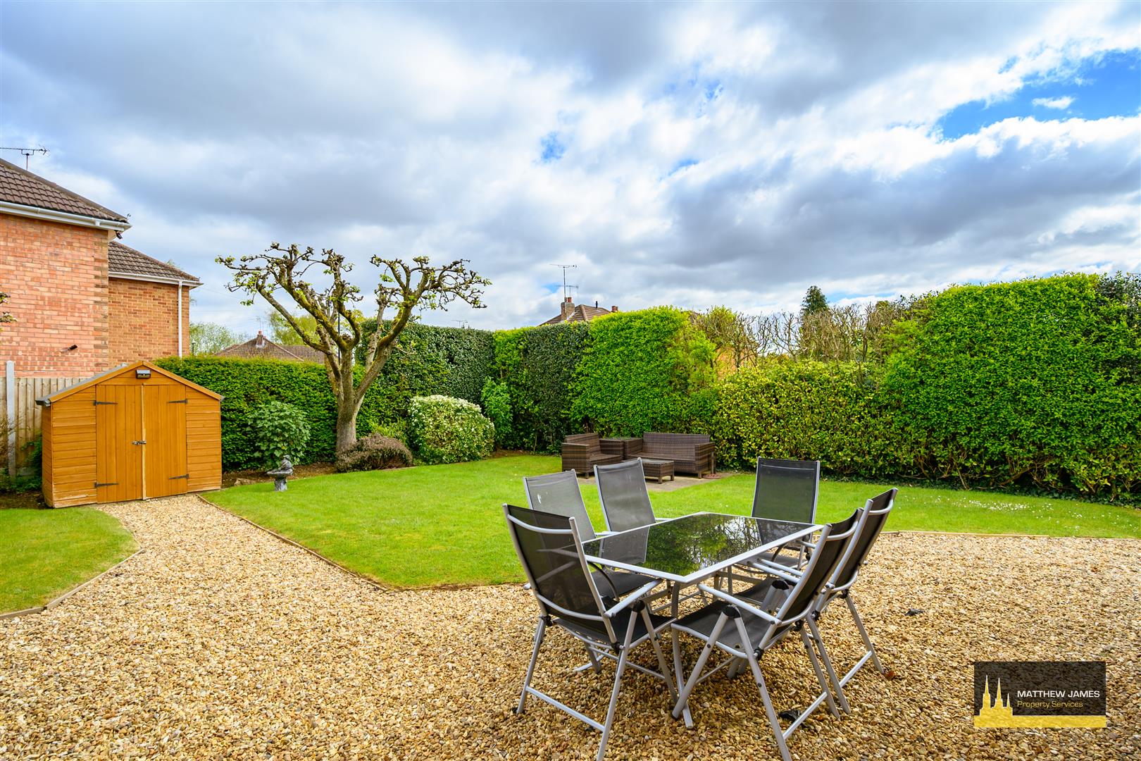 Being mainly laid to lawn with Cotswold stone chipping patio and pathway, mature planted borders with established plum and apple trees and hedge, 240v exterior power sockets, outside water tap, and fenced perimeter.