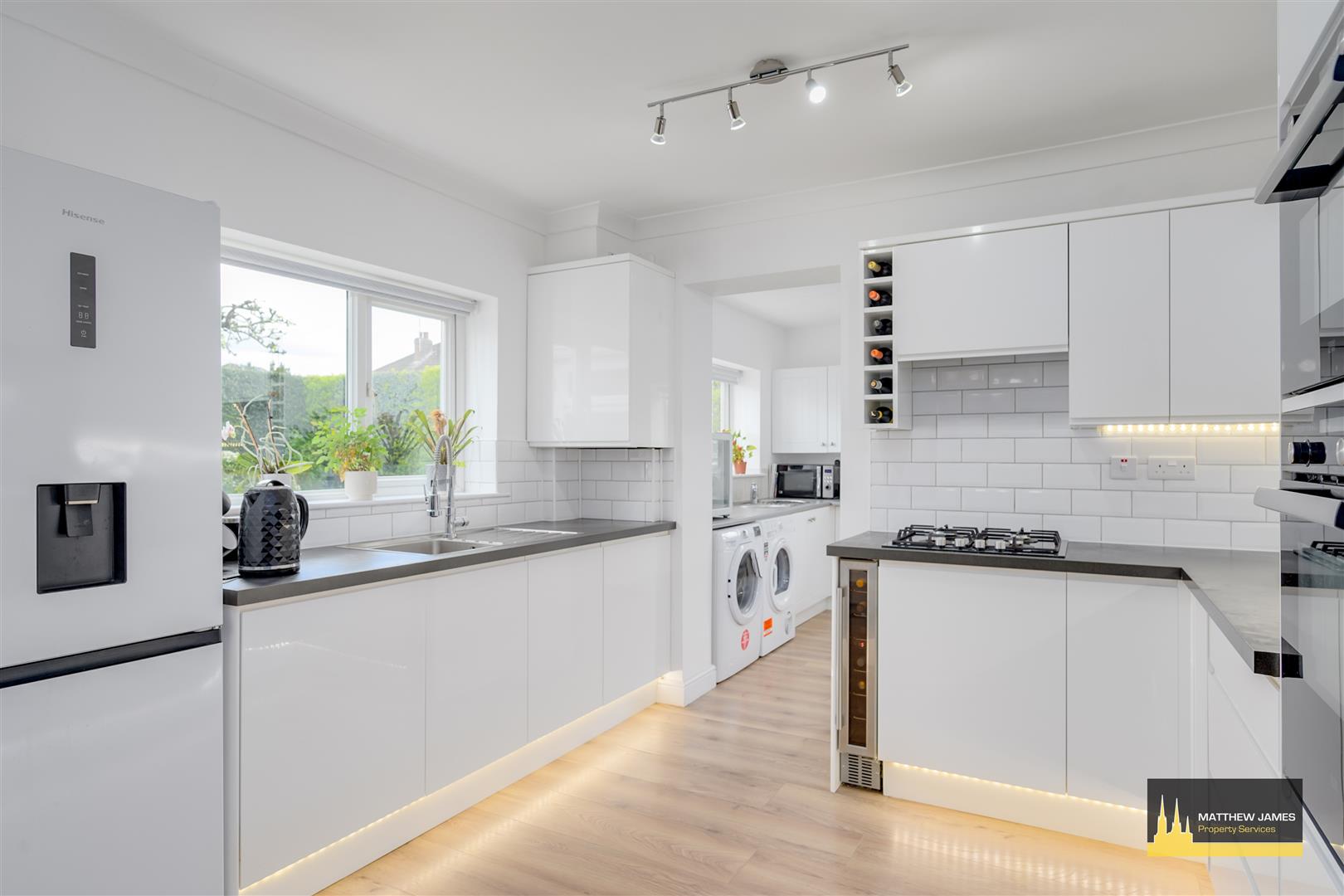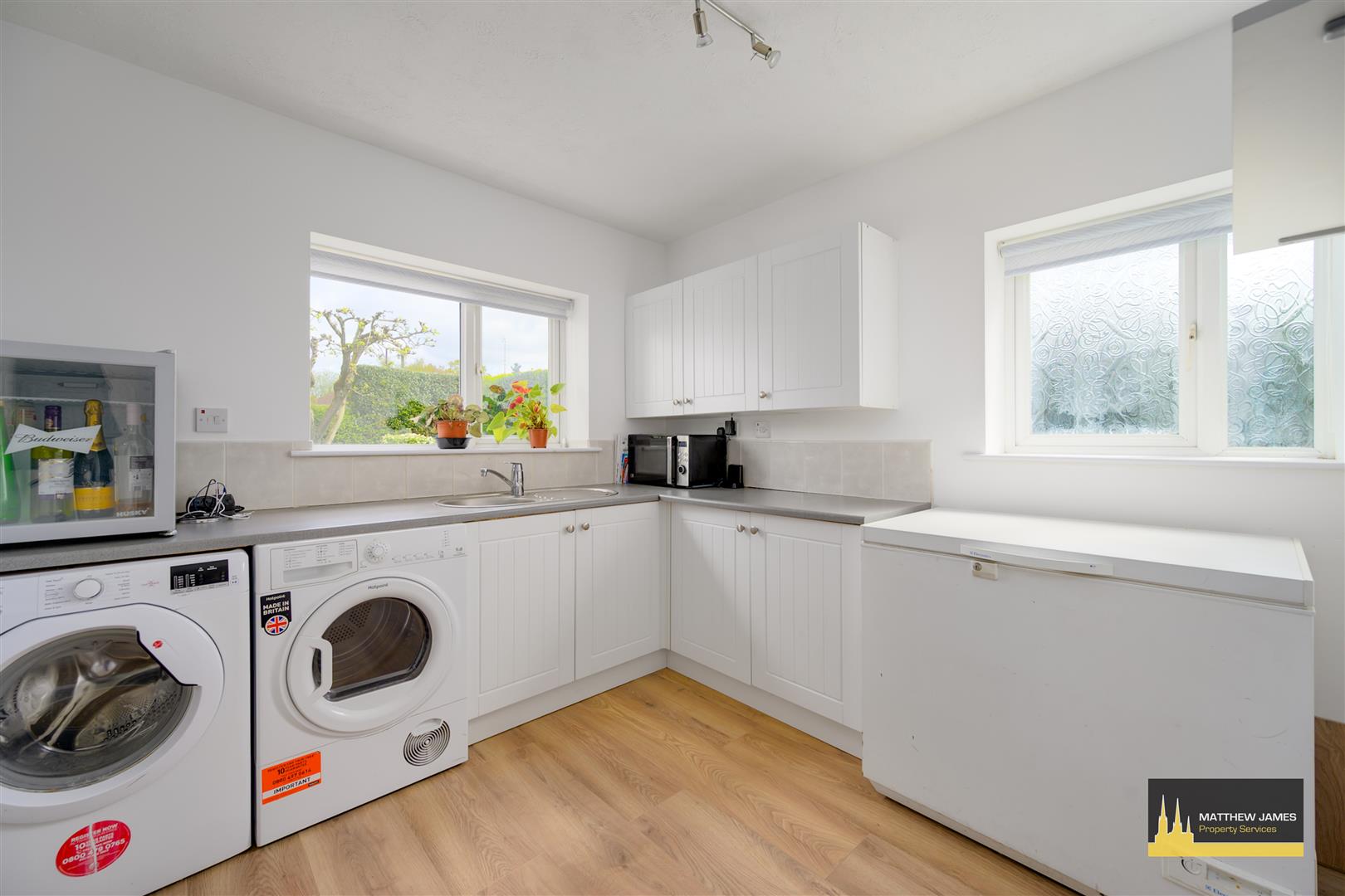 Having a PVCu double glazed window to the rear and PVCu double obscure glazed to the side elevation, a range of wall and base units with roll top work surface over, space and plumbing for a washing machine, space for a tumble dryer, space for a chest freezer of American style fridge freezer and door leads to the garage.