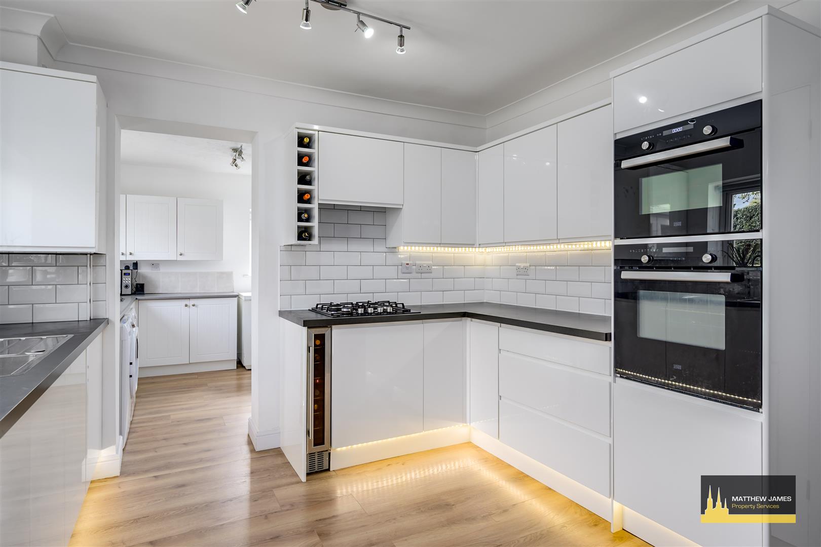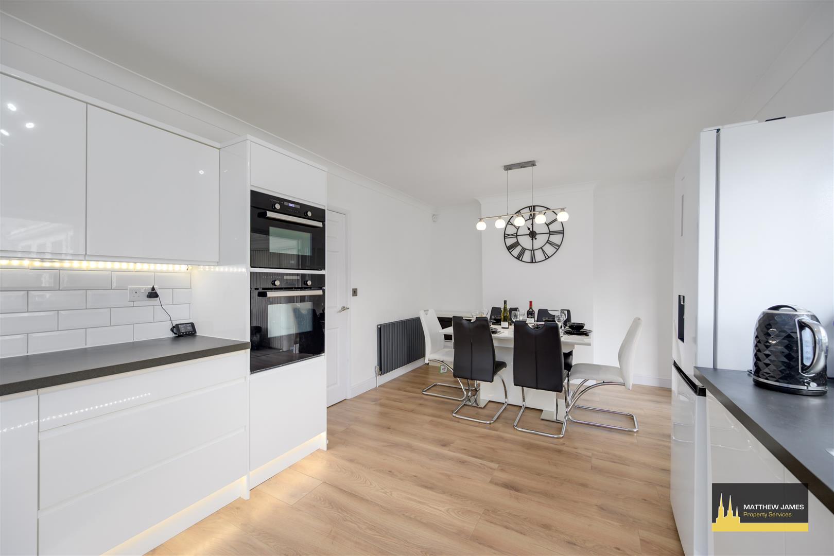 Having a PVCu double glazed window to the rear elevation, glazed timber doors lead to the day room / conservatory, a range of wall, base and drawer units with roll top work surface over, integrated wine cooler, integrated dishwasher, wall mounted combination central heating boiler, raised height double (self cleaning) oven with microwave and grill, four ring gas hob with extractor over, space for a fridge freezer, under plinth and counter mood lighting, dining area perfect for a large dining table and chairs with further mood lighting over, inset fireplace, modern white splash tiling and feature opening leads to the: