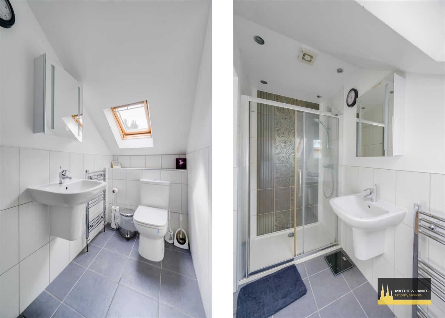 (Not Measured) Having a Velux window to the front elevation, walk-in double shower enclosure with power shower over, low level flush WC, wash hand basin, ladder style heated towel rail, illuminated mirror and tiling to all splash prone areas.