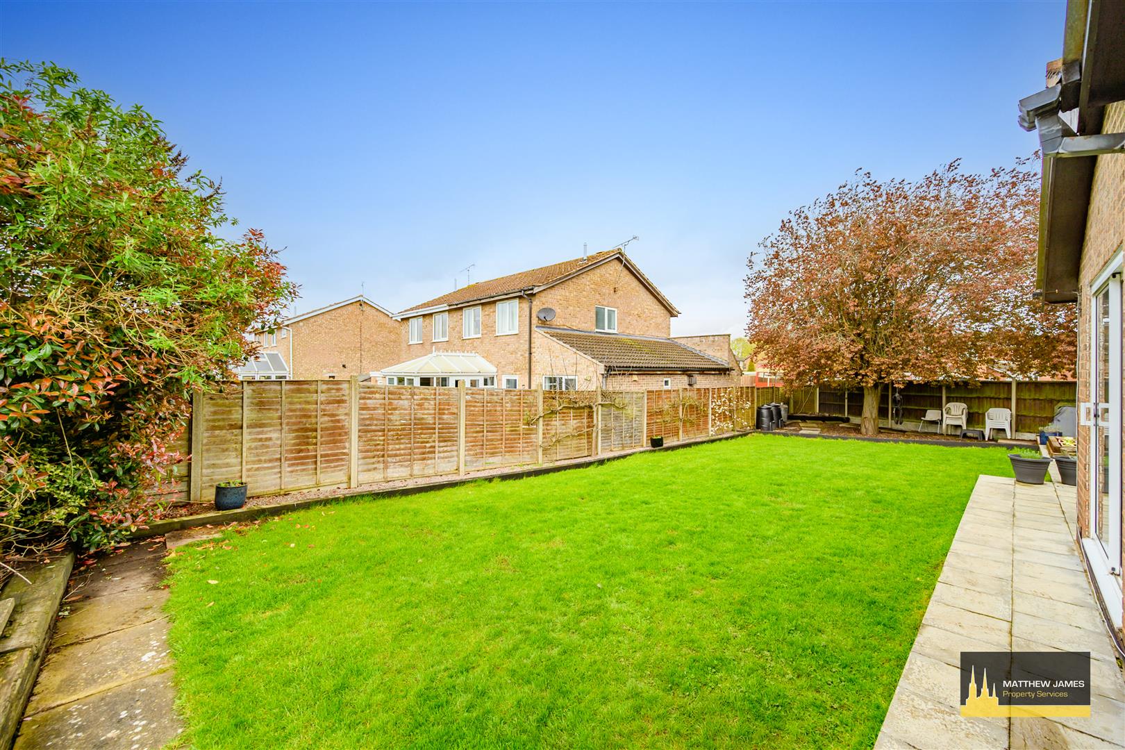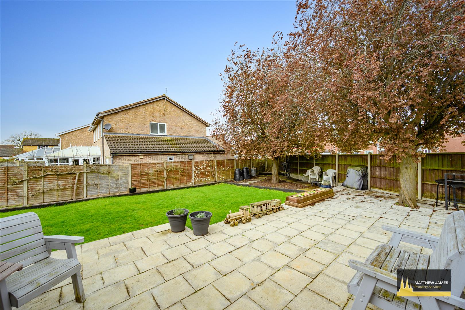 Being on a large corner plot, laid mainly to lawn with fenced perimeters, two paved patio areas, built-in garden shed, fruit trees and planted borders and a private pedestrian gate that leads to the front elevation.