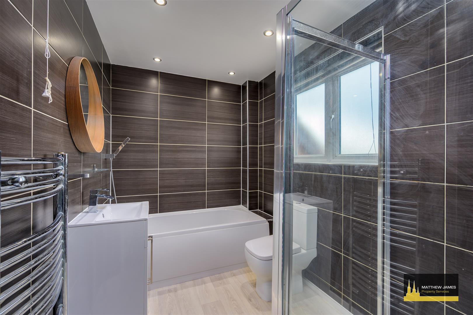 (Not Measured) Having a PVCu double obscure glazed window to the front elevation, panel bath with shower over, vanity wash hand basin, extractor, ladder style heated towel rail, walk-in shower enclosure with Mira Azara shower and tiling to all four walls.