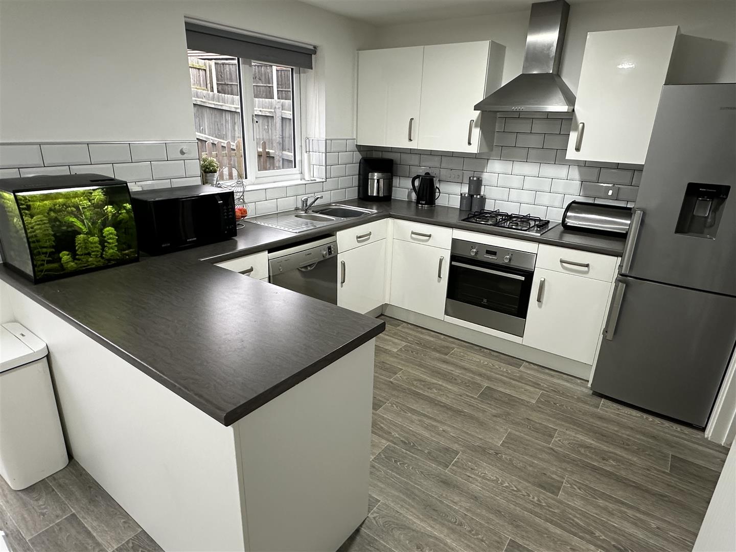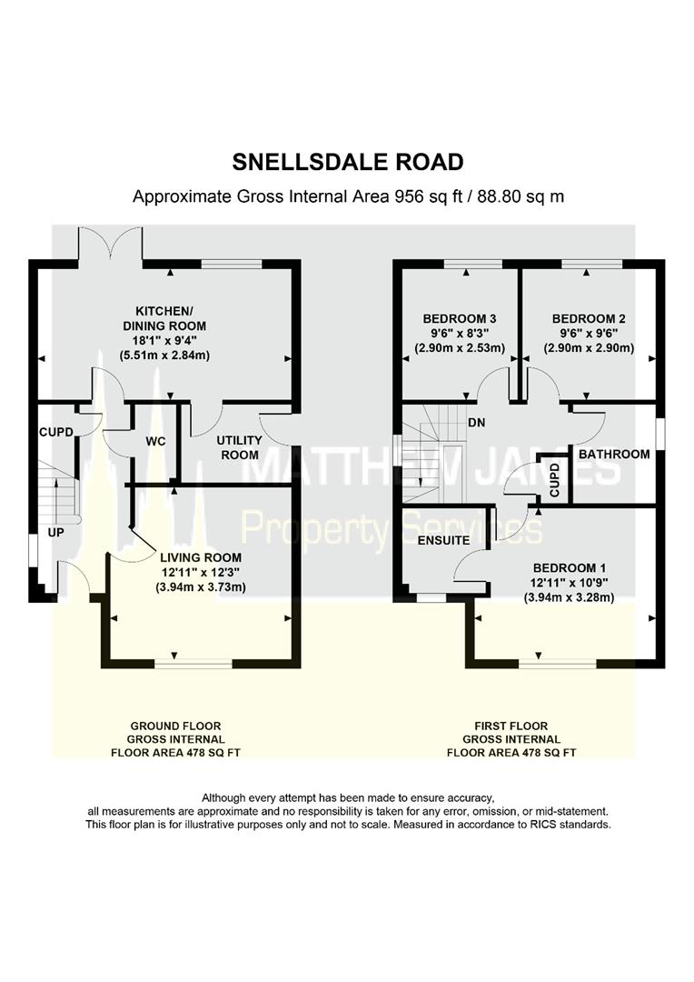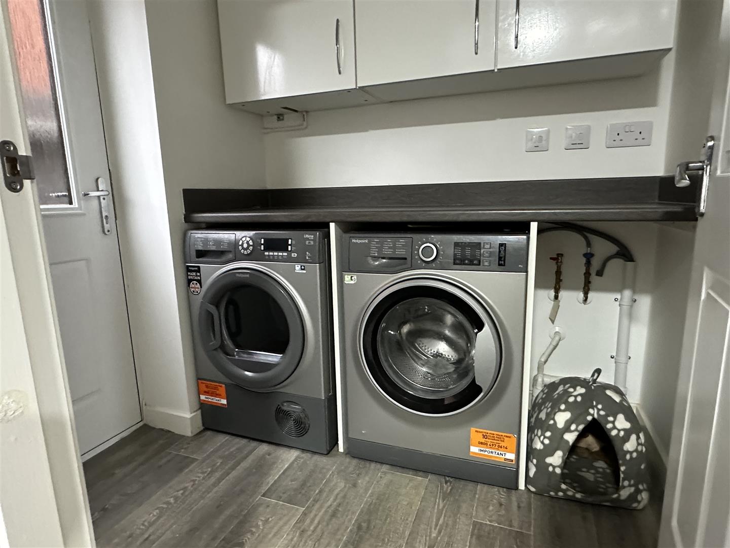 Having a double obscure glazed composite door to the side elevation, space and plumbing for a washing machine and tumble dryer with worksurface with upstand over and wall cupboards.