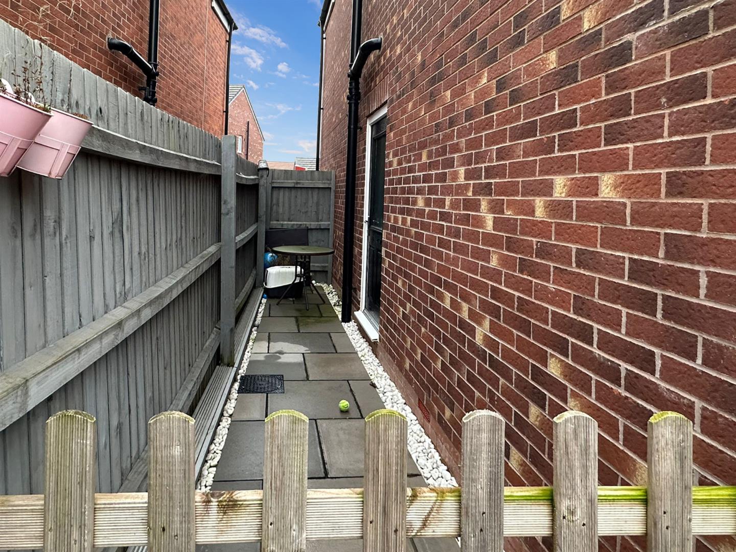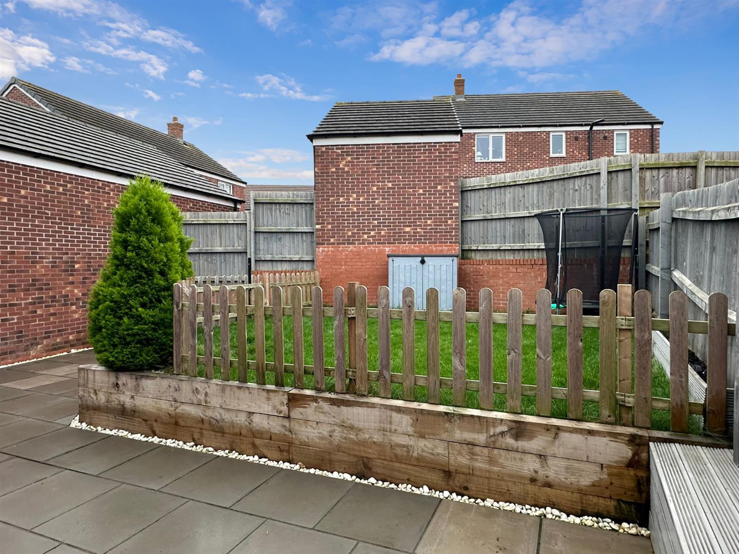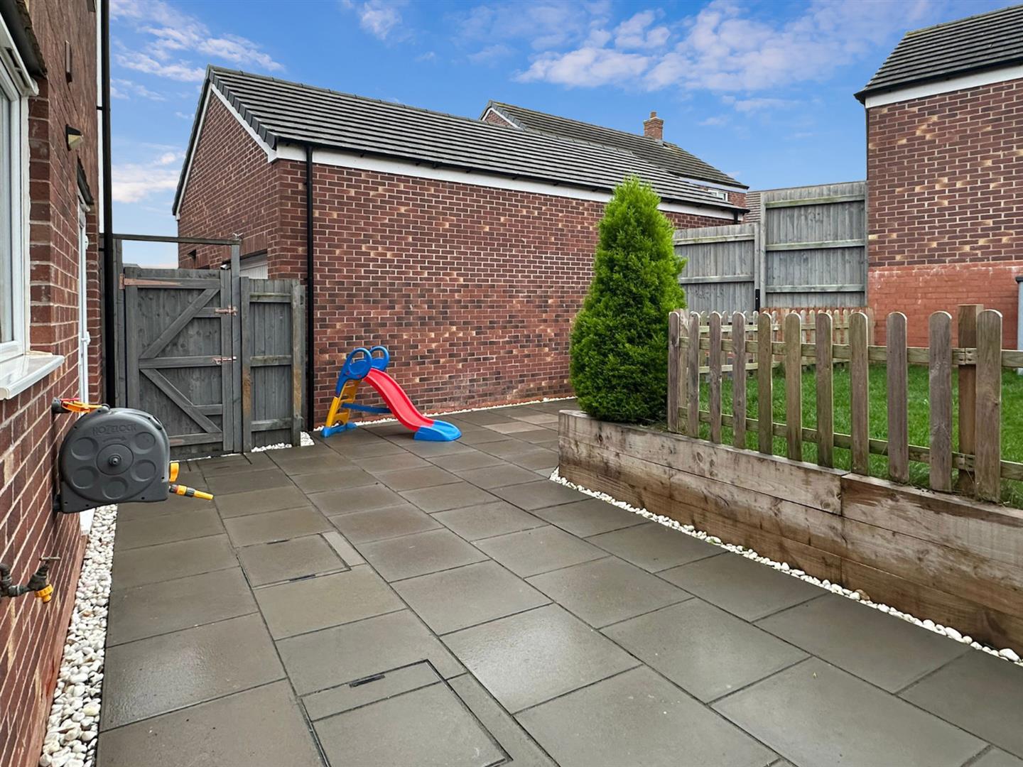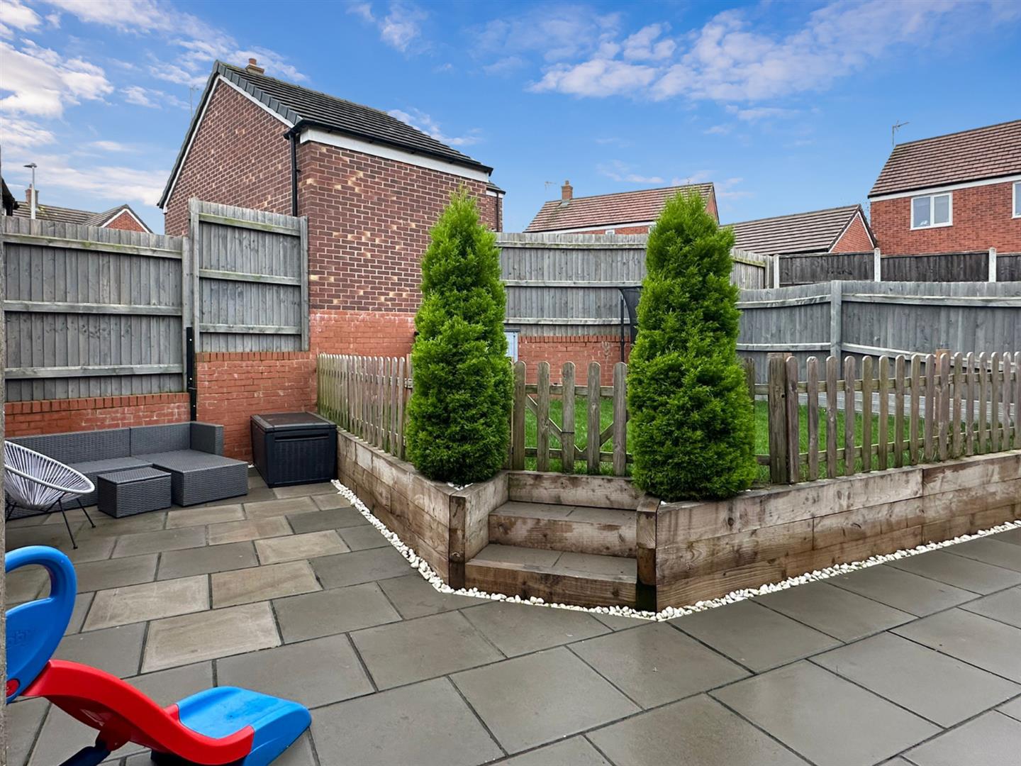 Being professionally landscaped with paved patio area, raised and retained lawned area with sleepers, side pathway that leads to the Utility Room and timber pedestrian gate that leads to the:
