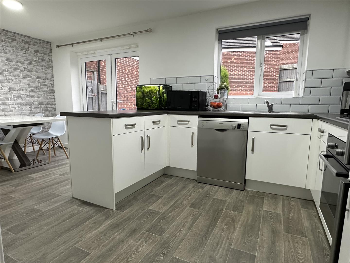 Having a PVCu double glazed window to the rear elevation, PVCu double glazed French doors to the rear elevation, a range of wall, base and drawer units with roll top work surface over, space and plumbing for a dishwasher, space for a fridge freezer, integrated oven with four ring gas hob and extractor over, seating area for dining, modern tiling to all splash prone areas and further door leads to the: